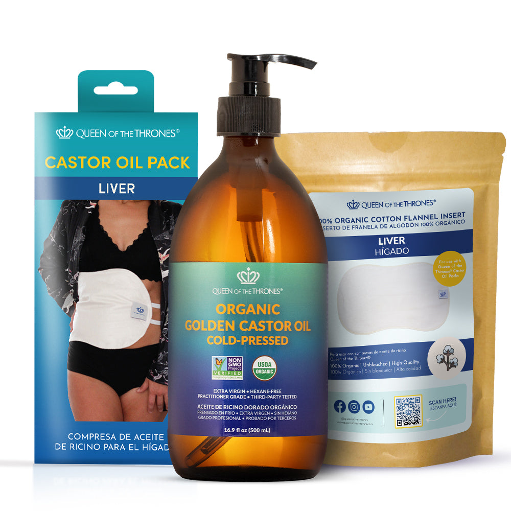 Paquete de aceite de ricino de hígado + inserto de algodón 100 % orgánico + 16.9 oz de aceite de ricino dorado orgánico
